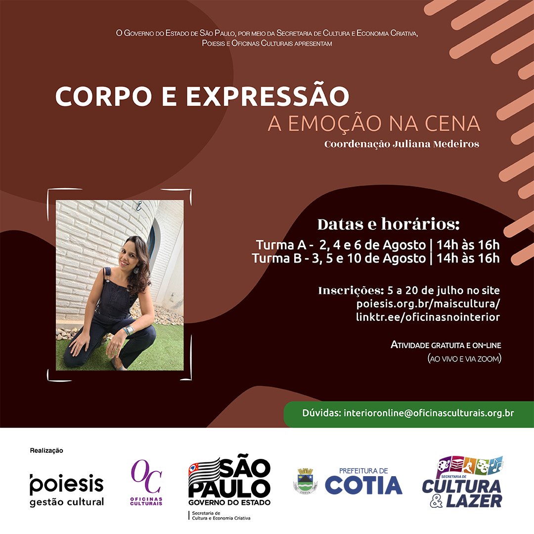 Estão abertas as inscrições para diversas oficinas culturais gratuitas que acontecem em agosto. As oficinas são oferecidas pela Poiesis Organização Social de Cultural, Secretaria de Cultura e Economia Criativa e, em Cotia, conta com o apoio da Secretaria de Cultura e Lazer.