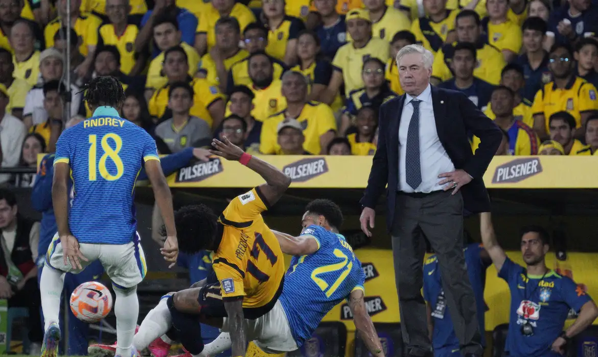 Os primeiros minutos da seleção brasileira sob o comando de Ancelotti não foram animadores. Com um Brasil guardando posição na defesa, o Equador assumiu o comando das ações. A equipe da casa trocava passes buscando espaços para entrar em uma defesa brasileira que não fazia muita pressão.