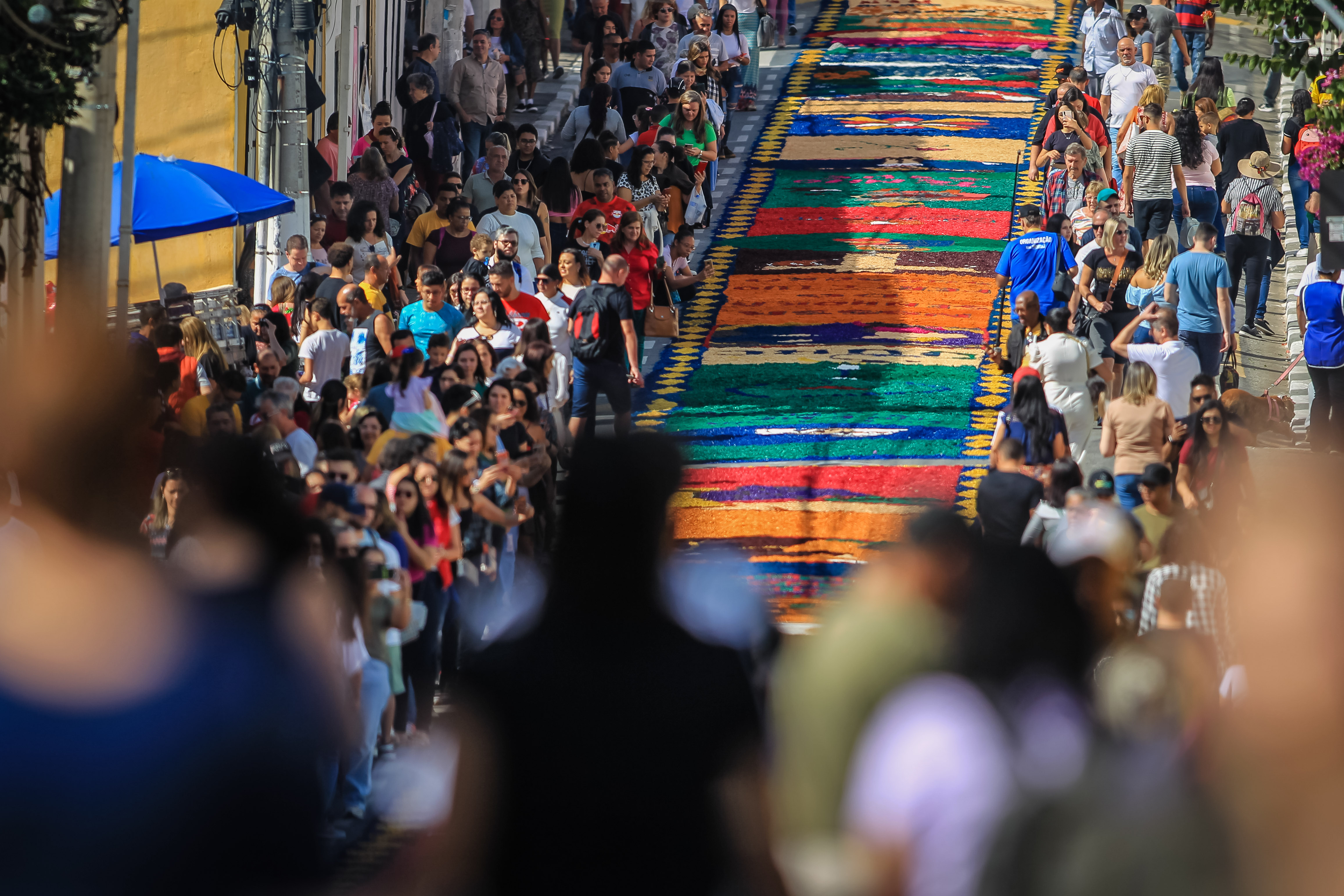 Desde cedo mais de mil voluntários entre membros das comunidades católicas, moradores e turistas se uniram na confecção de um tapete, dividido em 60 quadros e com mais de 850 metros de extensão com imagens bíblicas e figuras relacionadas ao tema do ano: “A eucaristia e as obras de misericórdia”.