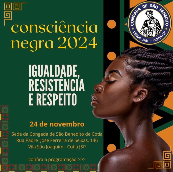 No dia 24 de novembro (domingo), a partir das 10h, a Congada de São Benedito de Cotia, localizada na Rua Padre José Ferreira de Seixas, 146, Vila São Joaquim, será o epicentro de celebração e preservação da cultura negra cotiana por meio do grande Festival da Consciência Negra 2024. A programação [veja completa abaixo] convida os participantes pela arte, cultura e tradição a conhecerem a memória e a ancestralidade que homenageiam a passagem do Mês da Consciência Negra. O Festival é gratuito e aberto ao público.