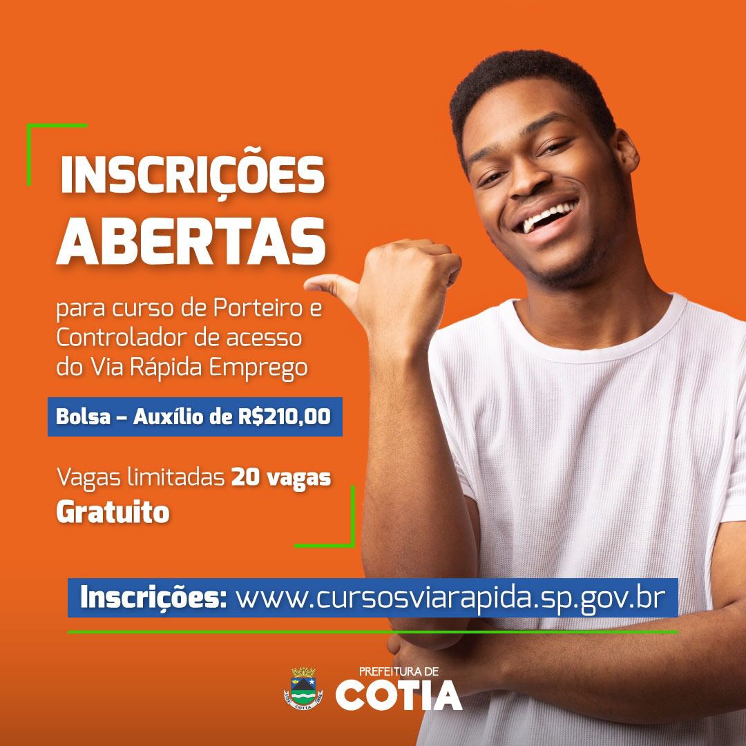 Estão abertas as inscrições para o curso gratuito de Porteiro e Controlador de Acesso para moradores de Cotia. A oportunidade conta com o apoio da Secretaria de Desenvolvimento Social. As inscrições devem ser feitas pelo site (www.cursosviarapida.sp.gov.br) do Programa Via Rápida do Governo do Estado.