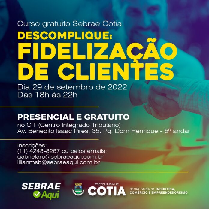 A Secretaria de Indústria, Comércio e Empreendedorismo de Cotia, por meio de uma parceria com o Sebrae Aqui, traz mais dois cursos gratuitos para pessoas físicas e jurídicas fidelizarem clientes: Descomplique Divulgação e Descomplique Fidelização de Clientes, que acontecem em setembro. As inscrições podem ser feitas pelo telefone 4243-8267 ou pelos e-mails: gabrielarp@sebraeaqui.com.br e lilianmsb@sebraeaqui.com.br. As vagas são limitadas.