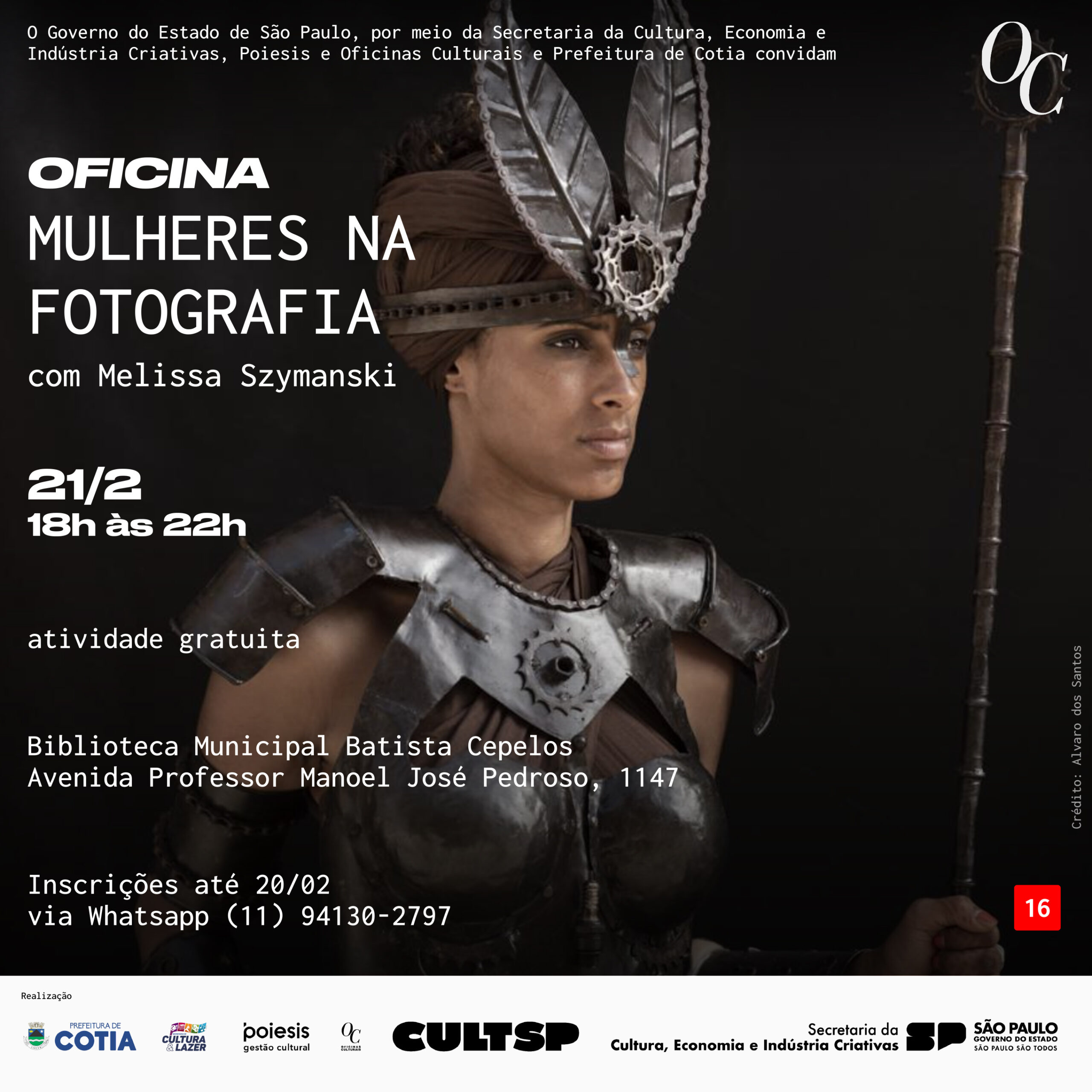Estão abertas as inscrições para a oficina ‘Mulheres na Fotografia’ que acontecerá nos dias 21 e 28 de fevereiro de 2024, das 18h às 22h, na Biblioteca Batista Cepelos. A oficina será ministrada pela fotógrafa Melissa Szymanski e acontecerá por meio de uma parceria entre a Secretaria de Cultura e Lazer de Cotia e a Poiesis Organização Social da Cultura – Programa Oficinas Culturais da Secretaria de Cultura e Economia Criativa do Estado de São Paulo. As inscrições podem ser realizadas via Whatsapp (11) 94130-2797 até o dia 20/02, às 16h.