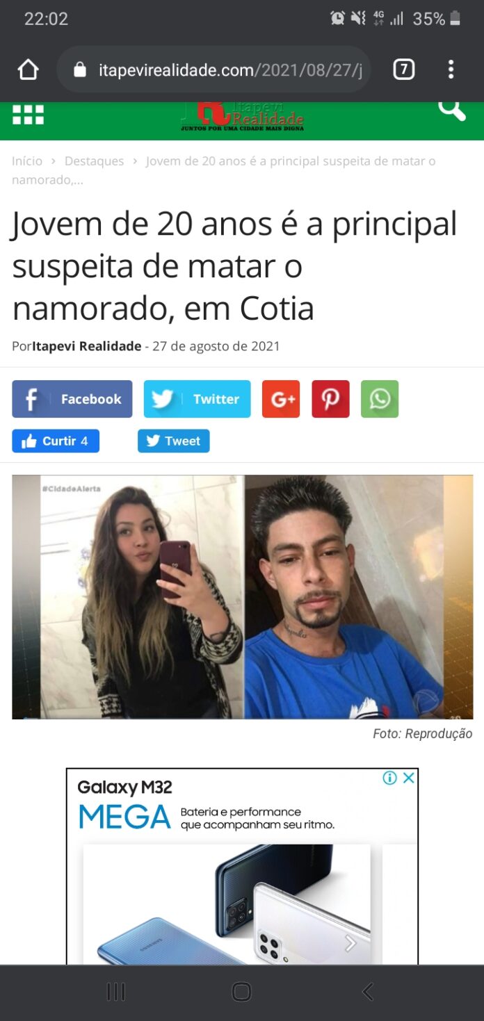 Reprodução/cotiaSegundo o R7, uma jovem de 20 anos é a principal suspeita de assassinar o namorado, de 23, em Cotia, na Grande São Paulo. O motivo teria sido por ciúmes.