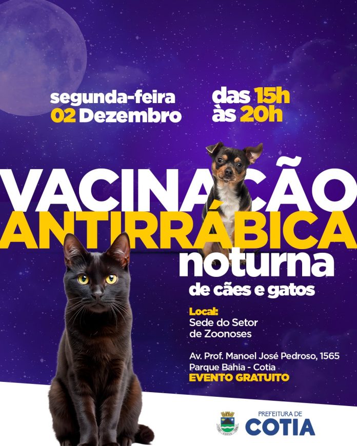 No dia 2 de dezembro de 2024, a Secretaria de Saúde de Cotia, por meio do Setor de Zoonoses, promoverá mais uma edição gratuita da Ação de Vacinação Antirrábica Noturna para cães e gatos.