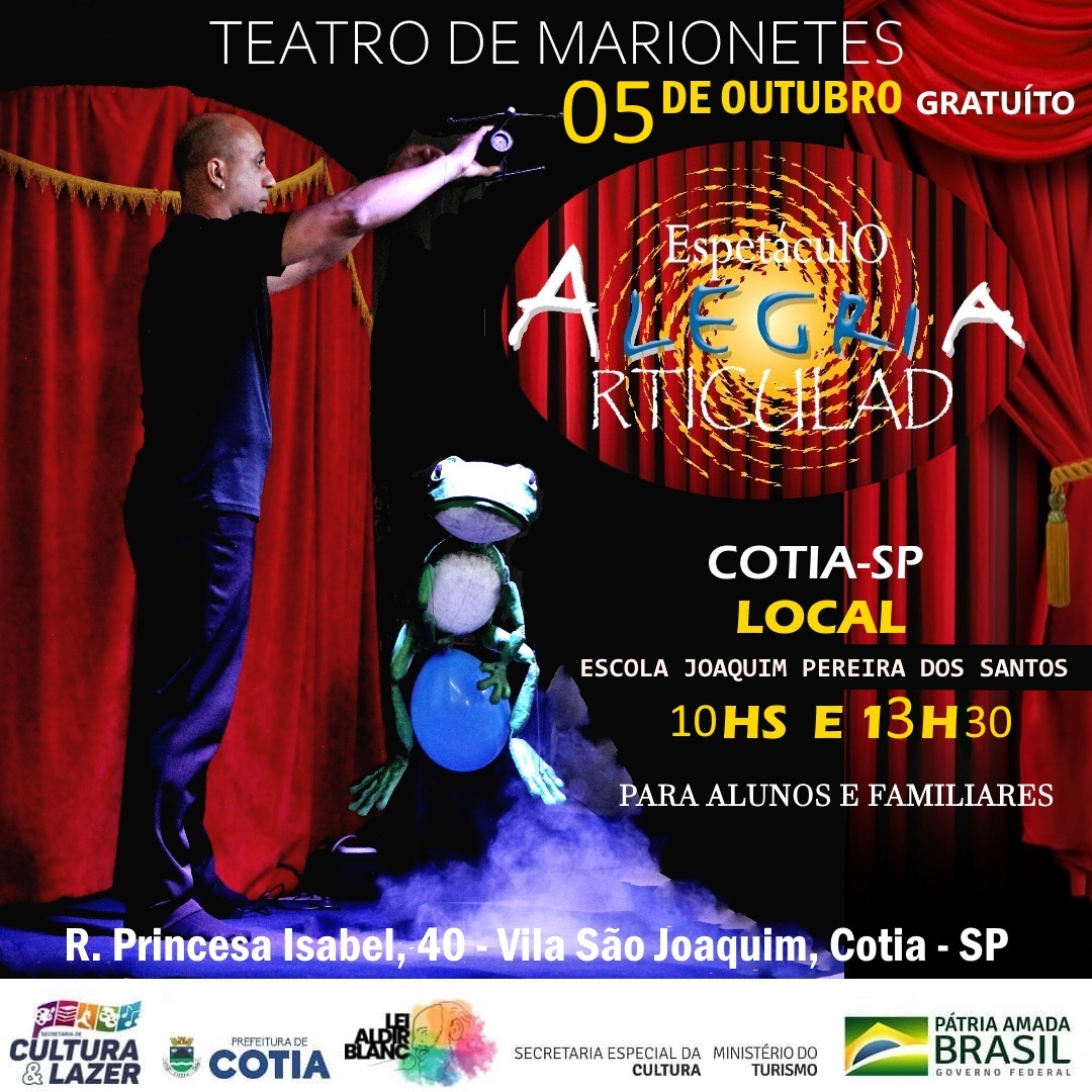 No dia 5 de outubro tem estreia do projeto “Espetáculo Alegria Articulada” para familiares e alunos da Escola Municipal Joaquim Pereira dos Santos. O projeto foi premiado pelo Edital Seu Dito da Congada, lançado pela Secretaria de Cultura e Lazer de Cotia com recursos da Lei Federal Aldir Blanc. A apresentação é de teatro de marionetes e vai passar por outras escolas da rede municipal em datas a serem confirmadas.
