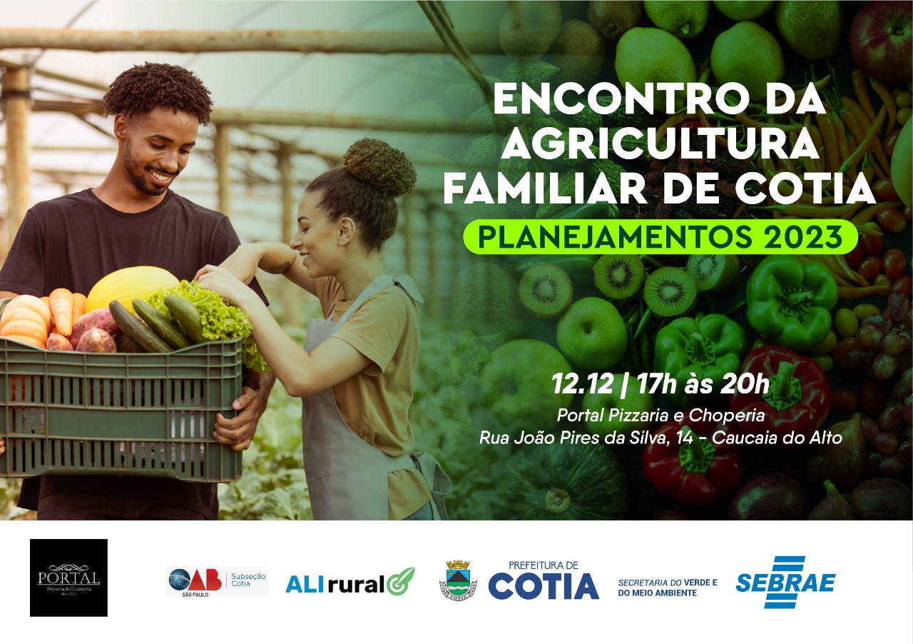‘Planejamento 2023’. Este será o tema do 1º Encontro de Agricultura Familiar de Cotia. O evento acontecerá na segunda-feira (12/12), das 17h às 20h, em Caucaia do Alto, graças a uma parceria entre a Prefeitura de Cotia, por meio da Secretaria do Verde e do Meio Ambiente, com o Sebrae, com a OAB subseção Cotia e com o ALIrural. O evento é aberto a todos os agricultores de Cotia e não é preciso fazer inscrição prévia.