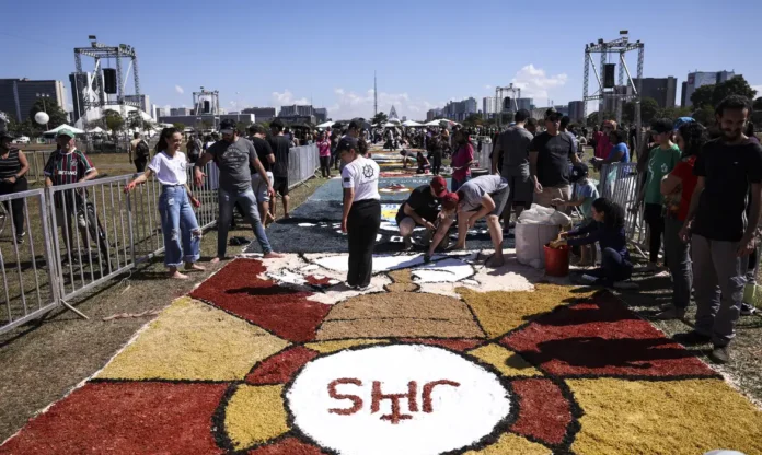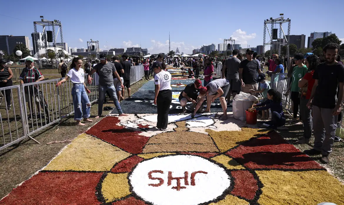 Conforme a arquidiocese, as atividades começaram por volta das 6h de hoje, com a montagem do tapete de 125 metros no gramado central. A montagem reuniu aproximadamente 600 pessoas integrantes de diversos movimentos, pastorais e serviços da arquidiocese.