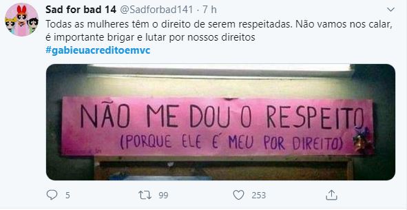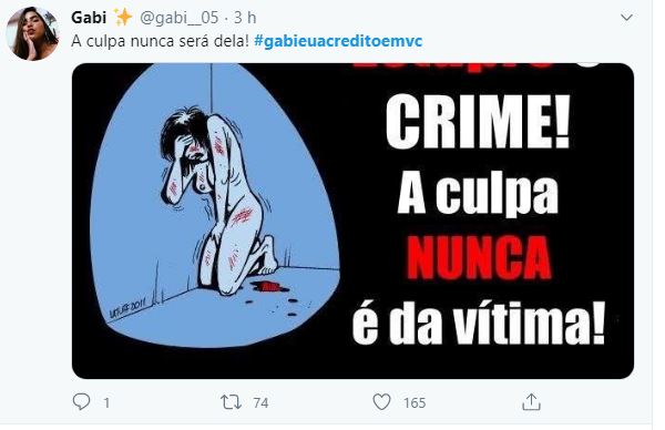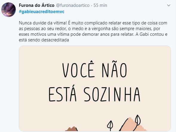 O caso tomou uma proporção maior quando algumas pessoas acusaram a menina de ter facilitado, por ter saído com o rapaz e ainda bebido. Alguns chegaram a falar que não acreditavam que ela não havia consentido. Foi então que a hashtag #gabieuacreditoemvc começou a tomar conta da WEB, estando entre as mais citadas no TWITTER.