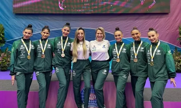 O Brasil fechou a participação na etapa de Portimão (Portugal) da Copa do Mundo de ginástica rítmica com a conquista de três medalhas de ouro. A primeira medalha dourada do conjunto formado por Maria Eduarda Arakaki, Nicole Pircio, Bárbara Galvão, Mariana Gonçalves, Maria Paula Caminha e Ana Luiza Franceschi veio no último sábado (10) no all-around, que consiste na soma das notas das séries mista e simples de uma competição.
