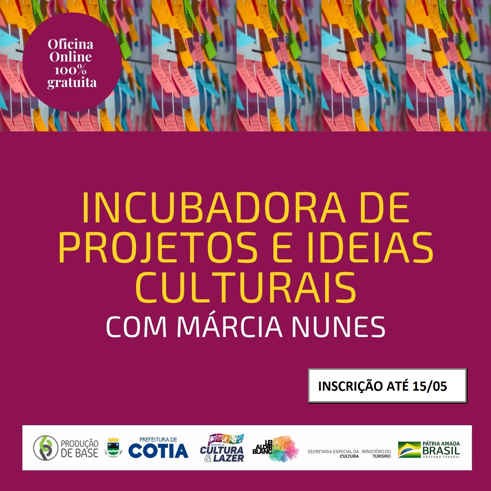 Estão abertas as inscrições para o programa formativo “Incubadora de Projetos e Ideias Culturais”, até 15/05. Trata-se de um espaço livre de compartilhamento de conhecimento que dinamizará aulas práticas e teóricas abordando todas as etapas de realização de uma ação ou projeto cultural. Ao final, os participantes receberão certificado. A incubadora cultural é mais uma iniciativa contemplada pelo Edital de Premiação Seu Dito da Congada, lançado pela Secretaria de Cultura e Lazer de Cotia com recursos da Lei Federal Aldir Blanc.
