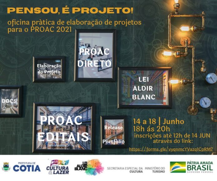 Estão abertas as inscrições para a oficina gratuita exclusiva para artistas, agentes e produtores culturais, organizações culturais privadas e do terceiro setor da cidade de Cotia: “Pensou, é Projeto!”, com a cientista social, administradora de empresas e produtora cultural, Silvana Bárbara, que acontece entre os dias 14 e 18 de junho, das 18h às 20h, com revisão de projetos entre os dias 21 e 25, mesmo horário. As inscrições devem ser feitas em https://forms.gle/vyqnmcYVazq1CpRM7. As vagas são limitadas e podem participar pessoas com idade a partir de 18 anos.