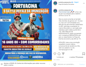 A campanha, que transmite a mensagem “FortVacina: O Battle Royale de Vacinação”, foi publicada nas redes sociais da prefeitura municipal, com a legenda “Junta o seu squad e se prepare para a batalha contra a Covid-19.”
