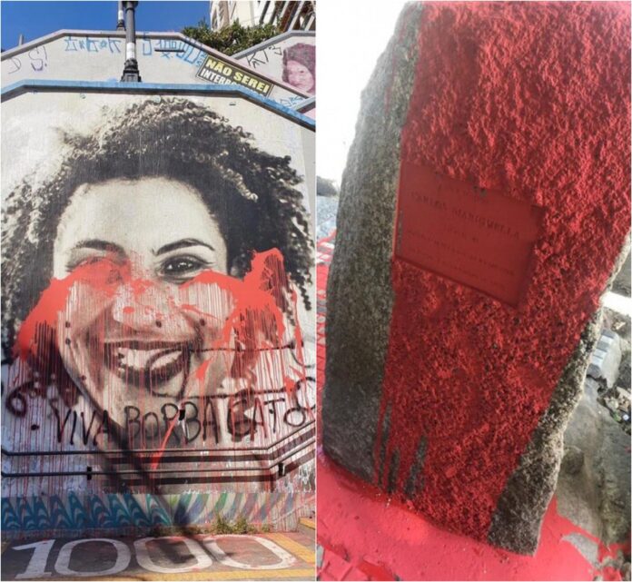 O escadão em homenagem à vereadora carioca Marielle Franco (PSOL), assassinada em 2018, localizado em Pinheiros, Zona Oeste de São Paulo, e o monumento em homenagem ao guerrilheiro Carlos Marighella, nos Jardins, Zona Sul, foram cobertos com tinta vermelha na sexta-feira (30).