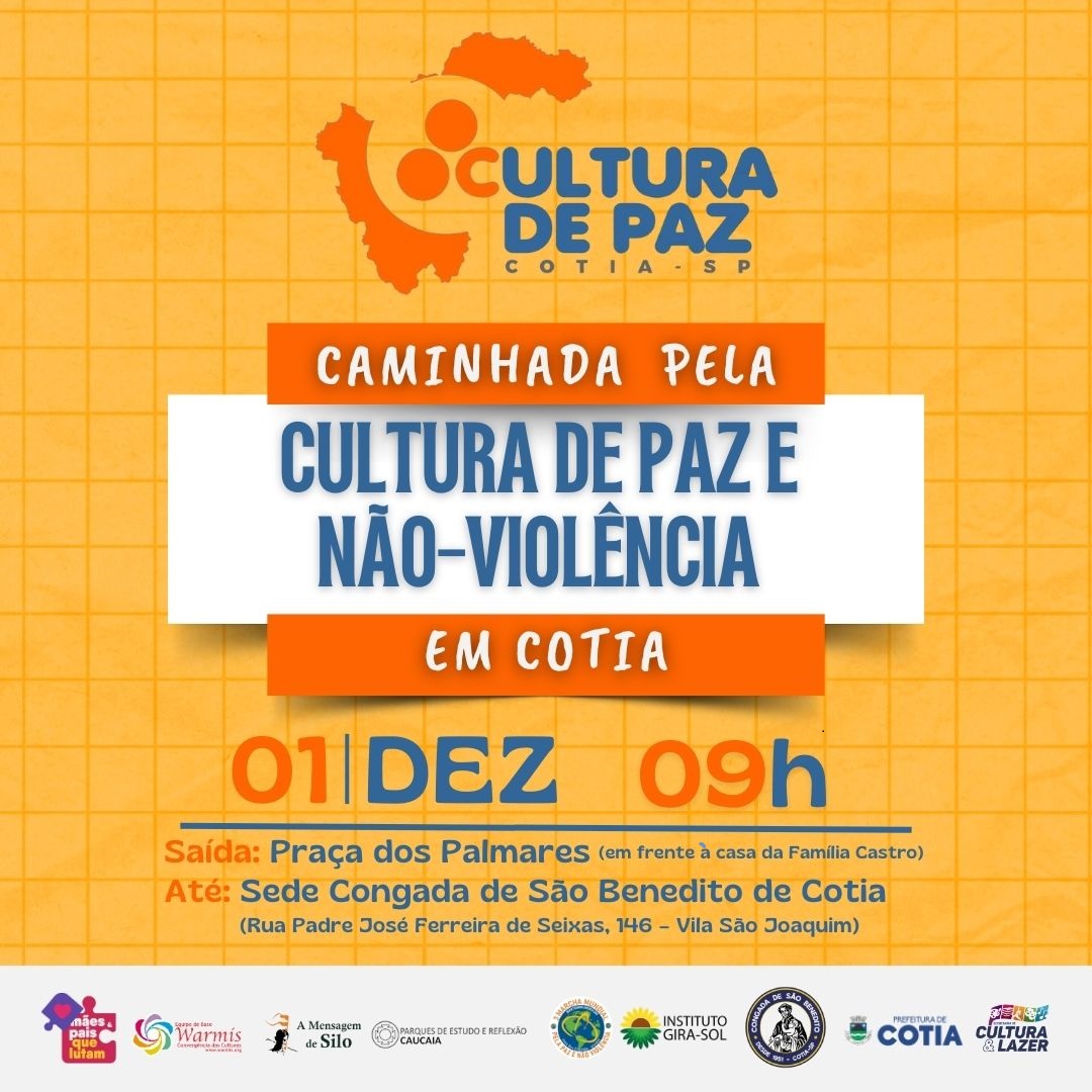 Está marcada para o dia 1º de dezembro de 2024 (domingo) a 7ª edição da Caminhada pela Cultura de Paz e Não-violência de Cotia. A concentração será na Praça Palmares, às 9h, e partirá até a Sede da Congada de São Benedito de Cotia, onde os participantes serão recepcionados com uma programação cultural livre e aberta ao público (Café com Axé).