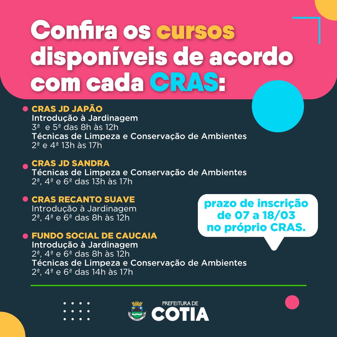 A Secretaria de Desenvolvimento Social prorrogou até o dia 18 de março o prazo de inscrições nos cursos profissionalizantes gratuitos do Senac. As aulas serão presenciais respeitando os protocolos sanitários de proteção à Covid-19 e à Gripe, as vagas são limitadas e as inscrições devem ser feitas nos Centro de Referência de Assistência Social (CRAS) [veja abaixo]. Para se inscrever é preciso residir em Cotia e ter inscrição no Cadastro Único.