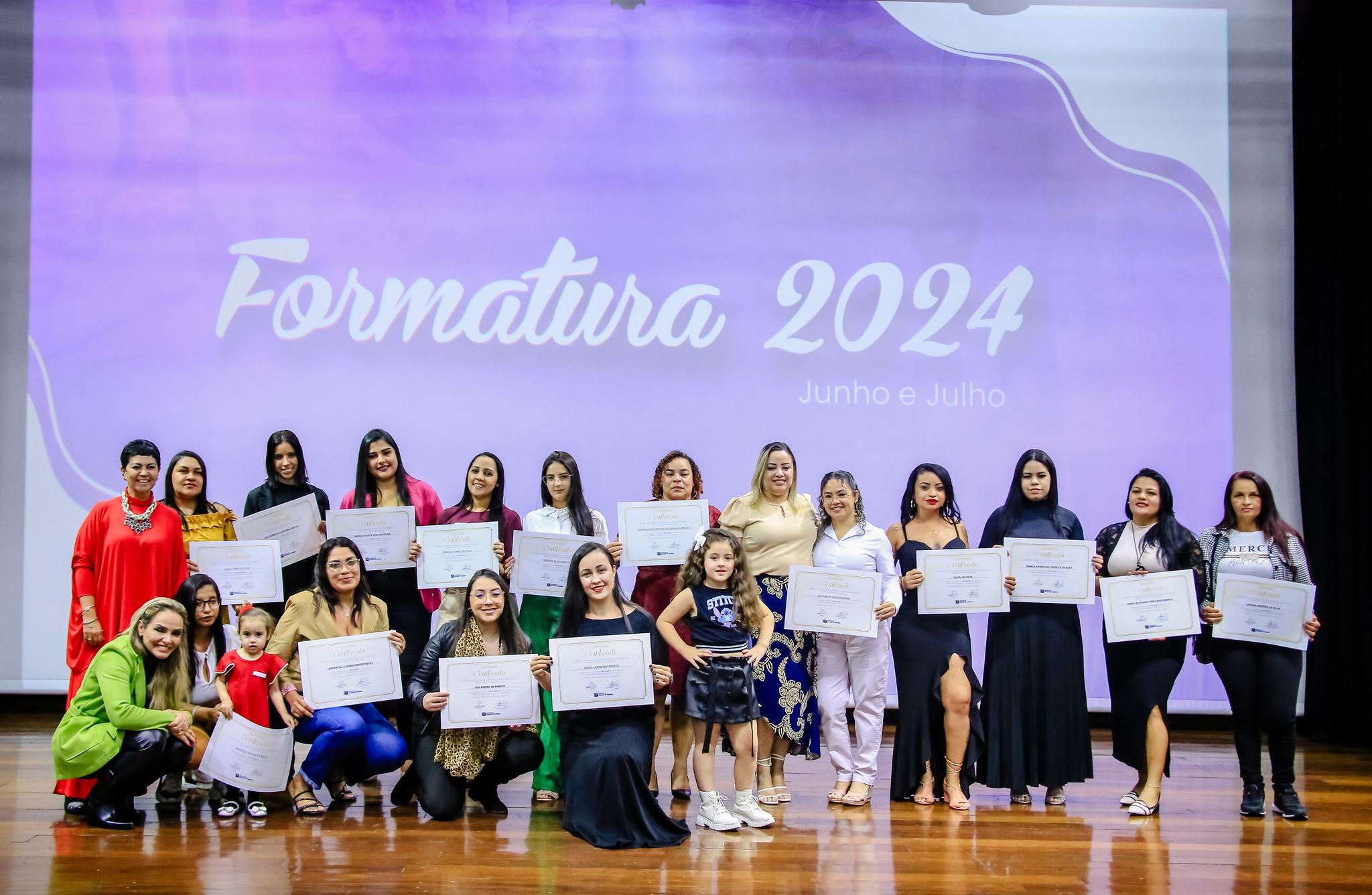 Ao todo foram entregues mais de 800 certificados para 54 turmas dos meses de junho e julho de 2024, dos núcleos Centro e Fazendinha. A cerimônia foi realizada na Arena de Eventos e contou com a presença de autoridades municipais, familiares e amigos dos formandos.
