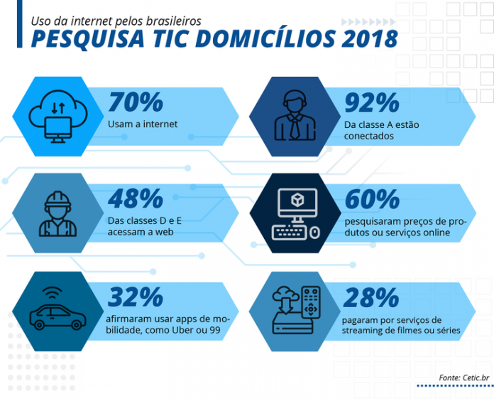 Sete em cada dez brasileiros acessam a internet, segundo a pesquisa TIC Domicílios 2018, divulgada hoje (28). O levantamento mostra a evolução da conectividade no Brasil, registra o papel persistente das desigualdades de renda e regionais e aponta o crescimento de aplicações diversas, como as de mobilidade e de consumo de vídeo e música.