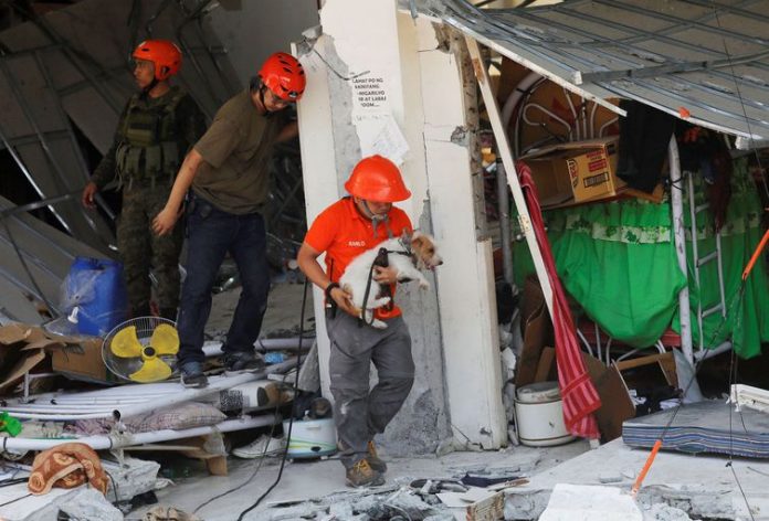 Os socorristas usaram guindastes e cães para procurar vítimas nos escombros.